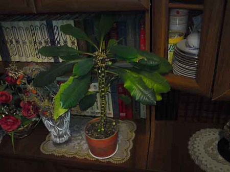 R@V, у молочаев, при всей их мощности и страсти к выпивке, корневая система - так, одно название. Поэтому в пересадке он у Вас на самом деле не нуждается, если Вы, конечно, не хотите поменять это ведерко из эстетических соображений. Но размер горшка оставьте такой же.