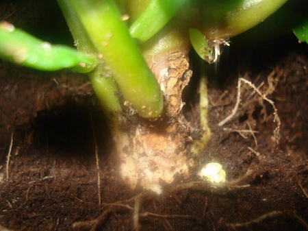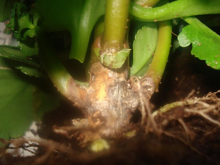 Решила пересадить каланхое, обнаружила вот таку гадость на корневой шейке . Корни здоровые, и даже новые стрелки растут. Как его спасти, не черенкуя? И вообще что это и от чего??Растеник подарено на день рождения...хелп