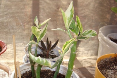 Ой, и тут тоже интересненько... Нарвала черенков педилантуса вариегатного, воткнула в грунт, поставила на восточное солнышко и забыла на пару месяцев... Появилась уже поросль, постараюсь на днях сфотографировать. Уже Вот мой малыш... Растет!!!
