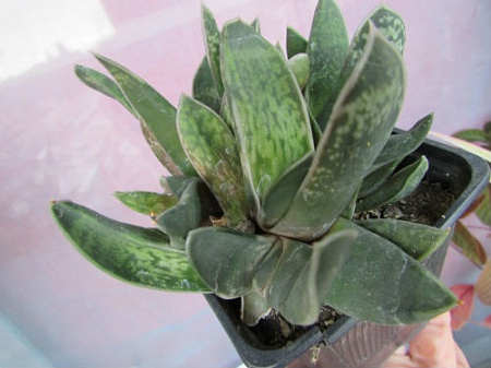 После таких красавиц моя скромненькая не сделает погоды,но люблю её, и как кристатка (как сказали при продаже) она мне интересна. Явного гребня пока нет, но нет и главной "мамы" и боковых деток, а точки роста появляются между парами листьев, иногда по две (как видно на первом фото). Год назад, когда купила, было три точки роста, теперь - семь. Однако, наверное, правильнее будет сказать, что это не кристатная, а монстрозная форма, так как кристатка все же предполагает наличие гребня, а монстрозность может иметь раные формы. На фото - моя Gasteria gracilis f.monstrosa, теперь правильно Gasteria obliqua, по сведениям, предоставленным Tsur (спасибо!)