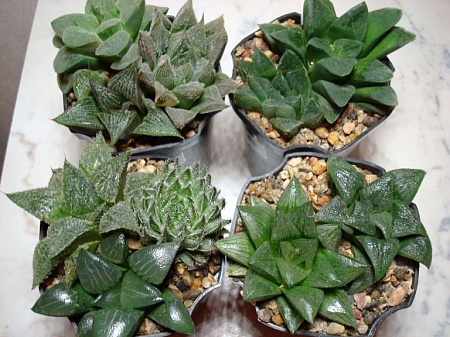 Ндааа... Я выращивала и буду далее выращивать свои суккуленты и кактусы в земле из леса. Я уже писала - беру четверть земли на три четверти разрыхлителей (любых). Землю не обрабатываю. Никогда у меня в горшках не заводились черви!!! Все мои хавортии, гастерии, сансы и кактусы растут в одинаковом грунте. Поливаю суккуленты (про кактусы говорить не буду) весной и летом раз в 2 недели. Осень-зима - полив в сентябре, в ноябре, в январе. Пересаживаю из сухого грунта в сухой. Стараюсь пересаживать зимой (у меня в это время года больше свободного времени). Вот эти хавортии буду сейчас пересаживать. Считаю, что они выглядят не хуже, чем у тех, кто выращивает свои суккуленты в гидропонике.