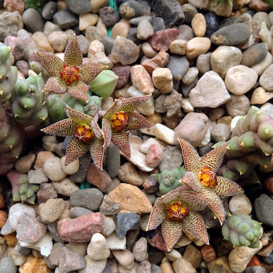 Сверху Huernia piersii, слева Huernia volkartii, справа Duvalia polita