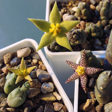 Сейчас жду цветения желтого Echidnopsis cereiformis, Tromotriche longipes, Hoodiapelia beukmannii и нескольких гуэрний