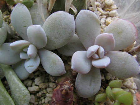 Nattalli, сейчас, когда на балконе похолодало и окраска растюшек становится ярче, я заметила, что мои молоденькие Лау тоже имеют слегка розоватый оттенок по краям листьев! А большая старушка - нет, стоит бело-голубая