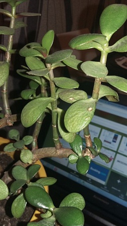 Не первый год растет толстянка, но большую часть времени листья тонкие, вялые, немного сморщенные. Понемногу листики отпадают, хотя ствол дерева твердый. Со временем стебли начинают виться вниз.