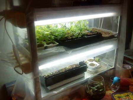 Все просто. Тапличка состоит из 3х полок, на каждой 5 ламп, сверху полиэтиленоый чехол с прорезями - окнами, коотрые можно отпускать и поднимать. На ночь, когда включаются лампы, окошки открываются, иначе в тепличке будет +50 а то и выше, а днем, тепличку выключаю - окошки закрываю, получается что все остывает постепенно и кошкоморды свои морды не так суют туда в мое отсутствие Поливается все снизу в плошки, вода бывает стоит немного, но за ночь лишнее испаряется и просто не поливаю пока не просохнет. ПОлучается полив чистого вермикулита раз в 2-3 дня. Посеяны адены в баночки из под детского творога (100гр) типа ТЕма, продырявленные в 2х местах. Вермикулит приходится досыпать через месяц после посева, оседает и попы хуже толстеют, я сравнивала с оголенными:) Вроде все. На днях доеду до дома, сфотать может получится