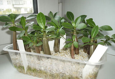 Меня больше всего впечатляют даже не сроки зацветания (тут уж точно надо сделать поправку на климат ), а обилие цветов в первое цветение, тем более одновременно раскрытых . Тем более - таких красивых . Уж это качество, как мне кажется, меньше зависит от условий, а больше - от врожденных свойств данного конкретного культивара. У меня тоже, бывает, закладывают кучу бутонов, на целый букет, но, если условия не нравятся - отсушивают все или часть. Но моя "куча" - это 4 - 5 на первое цветение, и распускаются они по очереди; а рекордом было 4 одновременно раскрытых цветка, и только во второе цветение. Немножко добавлю про сорта: строго говоря, для адениумов имя "сорта" применимо только к растениям, полученным путем вегетативного размножения (т.е. выращенные из черенков или прививки веточек маточного растения, которое и было названо данным именем). Это верно не только для адениумов, а и для многих других видов культивируемых растений: для луковичных, или для роз, к примеру... Сеянцы в любом случае тем же сортом называть некорректно, даже если они и похожи очень на родителя. В этом случае, если какой-то признак хорошо повторяется в поколениях при семенном размножении, можно применить термин "линия" от такого-то сорта, например. А в Таиланде - да, мастера "сорта" штамповать, как у них только фантазии хватает на названия .