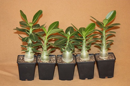 Тот же Сиамадениум пишет, что карликовые формы получаются (выщепляются) среди нормальных, стандартных арабикумов. А что значит "карликовый"? Просто медленнорастущий. Поэтому, ничего странного в том, что появляется сеянец, который растетмедленно, нет. Это не истинные мини формы. Поэтому и растут из карликовых семян и крупные растения. В этом году в марте сеяла семена гибрида F2 Golden Crown x Black Giant. Оба культивара полноразмерные, стандартные арабы. Но получился интересный результат: из пяти сеянцев четыре обычные, стандартные, хотя и все разные по форме листовой пластины, форме и окраске каудекса от стандартного светлого до темно-коричневого. И единственный сеянец получился некрупный, усиленно растущий в толщину и нехотя в высоту. В возрасте шести месяцев он был девять с половиной сантиметров в высоту и четыре сантиметра в диаметре. На фото он в центре.