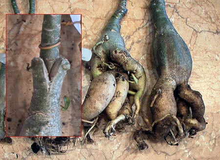 В наше время всё продается Основное поставщики - Таиланд, Тайвань, Индия и тп. Это самые "урожайные" на адениумы места и самые дешевые. В Европе и Штатах адениумы такого возрастата и размера будут стоить много дороже, а не 3-5$ как там, поэтому имеет смысл заказывать именно из Азии либо затариваться адениумами при посещении этих стран в качестве туриста. Черночки как правило мало кто продает, т.к. выгоднее продавать в более презентабельном виде, уже с попами. На "безродно-безымянные" попы хитрые восточные люди прививают черенки опр. сортов. Чьи это каудексы, какого именно вида - не знаю и, боюсь, никто не скажет. Пример на фото ниже. (а еще меня мучает вопрос: КАК, КАК они ЭТО делают? Я про каудексы... Такие заковыристые шедевры нам с нашими посевными просто не светят Тут налицо какая-то технология... В общем, господа пополюбы , кто встретит в сети инфу на эту тему - поделитесь, плиз, ссылочкой)