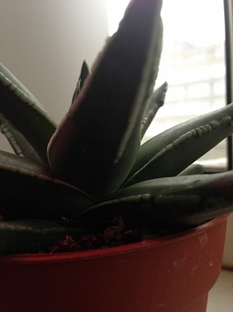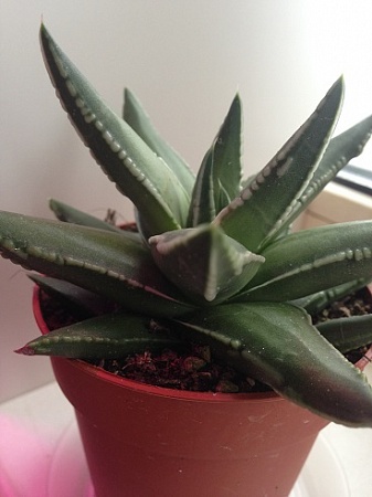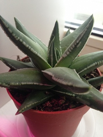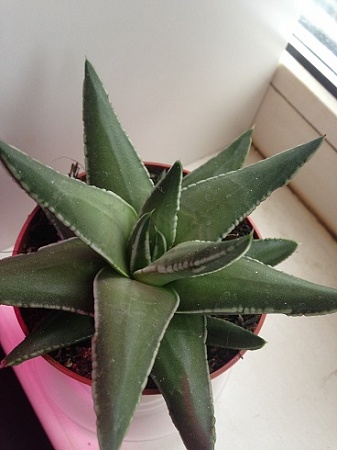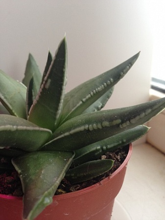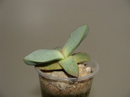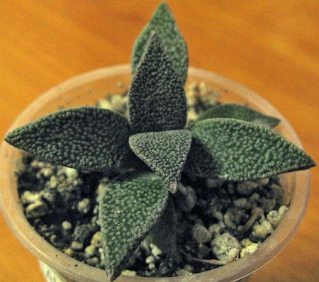 Растет компактно, листва зеленовато-сизая, очень плотно сидит на стебле, диаметр побега 2-2,5 см. Цветет желтыми цветками на высоких цветоносах в июне.