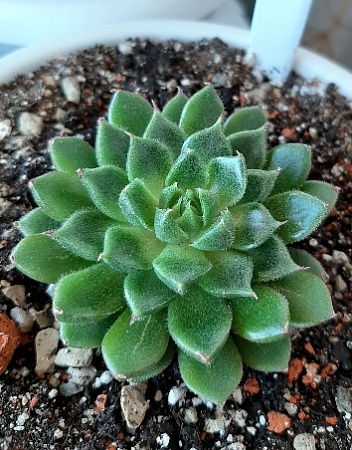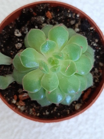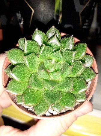 Верхние листья молочно-зеленого цвета, по мере роста зеленеют. Детка вон лезет сбоку тоже светлее, чем лист под которым появилась. Камера это передает хуже, чем в живую, никак верно поймать не могу этот переход цвета. Растет под лампой, света достаточно, но не краснеет, так и остается приятно-зеленой.