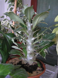 Из трех пахиподиумов: сандерса, жайи и ламера самый простой в уходе, по моему мнению, это - сандерса. Ни тебе возни с чернеющими/желтеющими листьями; сбросил листья - они потом опять вырастут; отрезал ему голову - он растет дальше :)