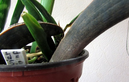 Этот лист надо убрать, 'на ножках' я бы, пока сансевиерия не адаптирована, не стала бы вести, это дополнительная нагрузка, она, она сейчас ни к чему, если сансевиерия у поставщика выращивалась с нормальным заглублением корневой шейки