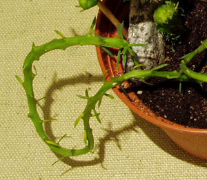 В прошлый раз пыталась укоренить этот же молочай в песочно-кирпично-вермикулитно-земляной смеси, он дал корешочки и новые маленькие листики, но потом постепенно засох: то ли недоглядела - пропустила полив, то ли слишком длинный был череночек.