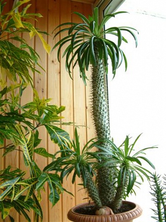 Татьяна Карпенко, рада за него однако, к примеру, Бирманн все-таки советует солнца - максимум, особенно учитывая, что по происхождению пахиподиум Ламери - мадагаскарец вот выдежка: Author: Emmanuel Drake del Castillo 1899 Family: Apocynaceae Habitat: Madagascar Soil: Mix Water: Medium Sun: Maximum Thickness: 30 centimetres Height: 5 metres Flower: White Reproduction: Seeds Pop names: - Synonyms: Pachypodium ramosum Costantin & Bois 1907. Pachypodium rutenbergianum fo. lamerei Poiss. 1924. Pachypodium menabeum Leandri 1934. Pachypodium champenoisianum Boiteau 1942
