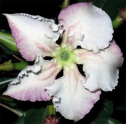 Зацвести в квартире пахиподиум Ламери скорей всего не удастся даже при южных окнах. А вот Сандерса цветут более легко. Татьяна Карпенко, какой у Вас красавец! А боковые отростки сразу были? Мой растет в один ствол - скоро окно перерастет. Листики тоже периодически чернеть начинают, причем только молодые. Чего только не делала - и поливала реже (а я и так поливаю раз в 2 недели) и наоборот чаще. Поливаю водой комнатной температуры. Потом смирилась- так и растем периодически лысея и обрастая за тем. Ну а это цветущий Сандерса, жаль не мой. (надеюсь хозяйка не обидется ) Ну уж больно красив!