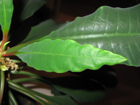 вот такая загадка случилась с моим молочаем - рос себе, рос, цвел и хорошел, никогда ничем не болел - и вдруг я замечаю очень странные молодые листья на верхушке: узкие, короткие, один даже какой-то подскрученный (последнее фото в этом посте). кончики у листьев острые - тогда как у всех остальных они округлые. прикладываю общее фото цветка и крупным планом старые, нормальнеы листья, чтобы было понятно, как они отличаются от новых, "проблемных".
