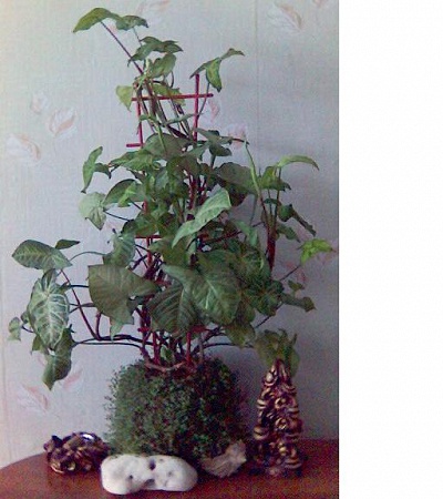 Он живет в большом пластиковом горшке с бамбуковой решеткой-лесенкой. Я хотела, чтобы он рос и цеплялся за перекладины и таким образом получался красивый кустик. Окно южное, горшок стоит в метре от окна. Он растет ВВЕРХ, и причем листья жутко тянутся к окну, мне приходится самой их выгибать в другую сторону и цеплять. И при этом они мельчают!