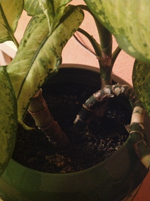 Только хотела начать описывать, как будет начинаться и протекать процесс гниения, а тут уже полная галерея иллюстраций на тему. Корни рассматривать нечего, ароидные легко заменяют полностью корневую систему, а вот "кариес" на стеблях - картина хрестоматийно классическая. Самое удивительное, на первый взгляд, что пятна этого "кариеса" всегда появляются в одних и тех же местах стеблей и развиваются по удивительно стандартному сценарию, как будто программа уничтожения, словно чип, встроена в импортные диффы.