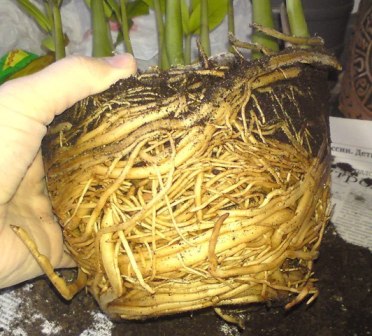 Доброго времени суток. В посте #1014 на стр 51 я выставляла фото своего замика. Вся вода при поливе вытекала в поддон, а видимая часть картошек была сморщена и я решила его пересадить. Когда вытащила ком, я обнаружила, что земли вообще нет. После чего пересадила, не трогая корней в более широкую (на 4см) посуду с большим количеством дренажа. Хотелось бы узнать, почему цветок нарастил столько корней, тогда как часть над землей не столь шикарна? Прошлым летом цветок был 1 раз сильно пересушен.