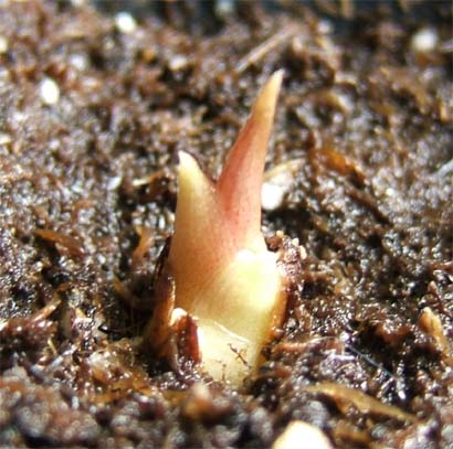 Я не обрабатывала, но проростала очень долго, около 6 месяцев, прошла прежде чем появился первый лист.Вот он