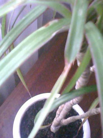 Была давеча у знакомых, у них тоже драцена, но больная и чахлая, они её не любили и кормили только пеплом от сигарет, ну так вот я попросила, что бы они мне её отдали. Выхаживаю теперь, пересадила в новый нормальный горшок, в новую земельку, поливаю удобрением, обрызгиваю 2 раза в день. Немного драцена похорошела и приобразилась, но вот я её взяла совсем с больными листьями, они все как бы в пересоших пятнах. Новые листики вылазят более живые,зелёные и здоровые, но на некотрых всё таки такие пятна всё равно есть. Фото прилагаю. Качество не очень, с мобилы. Как с этим бороться и можно ли победить?