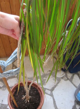 Итак - за неделю она не выпрямилась естественно, но начали желтеть нижние листики, я их оторвала, не скажу что отвалились от прикосновения, пришлось приложить немного усилий. Стволики все прощупала до корней - твердые. Но т.к. раньше я их так не осматривала - то не знаю, то что они немного сморщенные - нормально ли это.