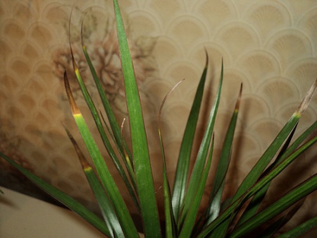 Здравствуйте. Драцена би колор, три месяца, всё время сохнут кончики листьев, стоит в 2,5 метрах от западного окна, полив по мере высыхания верхнего кома, раз в день опрыскиваю. Что с ней? Вот фото