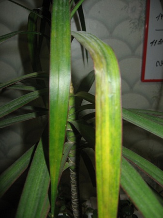 Уважаемые! Помогите пожалуйста. У меня в горшке 3 ствола драцены растет, у одного из них с начала начали желтеть и чернеть листочки, теперь новые побеги почти полностью почернели. Хотя этот ствол имеет 4 почки, которые только пробиваются. Пробовала пересаживать, корни в порядке но их не много. Что делать, что это может быть? Как спасти красавицу?. Очень прошу, помогите. Спасибо! Вот она такая