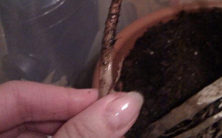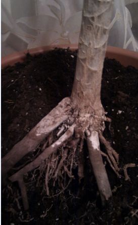 Два моих молоденьких ростка подросли, выглядели очень здоровыми пока несколько дней назад я не заметила, как на двух листочках начали желтеть краешки. Я поливаю эту драцену редко и по чуть-чуть, потрогав землю пальцем поглубже, т.к. ком земли большой и высыхает она долго. Мне не понравилось, что листья стали желтеть, земля на глубине 3-х см была влажная, но не мокрая. Я полезла к корням, откопала с одной стороны, и очень расстроилась, корни сухие, коричневые и один из отростков, только один! но он был мокрый, и если придавить из него сочилась жидкость. я взяла ножницы и обрезала его.