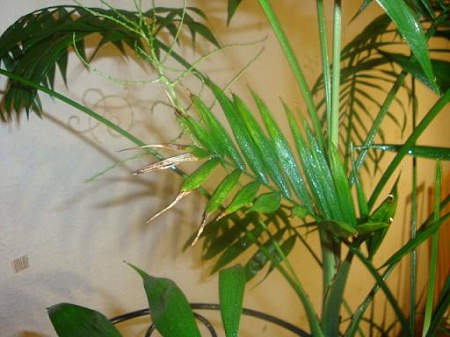 Подскажите, пожалуйста, что происходит с хамедореей. Листья буреют и засыхают. Причем засыхают не обязательно нижние листья, может начать сохнуть и самый верхний лист.
