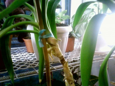Вот моя "калечка" на костылях Подвязала, но не думаю, что она окрепнет в тонком месте... Придется, наверное, по весне 3 растения сделать