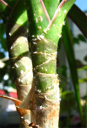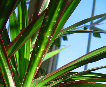 Братцы, помогите, пожалуйста опознать гада на драцене. Не белокрылка - сидит неподвижно, не трипс - не бегает и белый, а не тёмный, не червец - он хоть как, но выглядит мохнатым..
