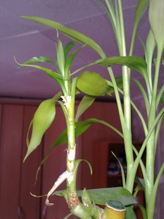 Здравствуйте! Подскажите пожалуйста! Имеется счастливый бамук(палка со спиралькой из букета). Уже четыре споловиной года. Основное растение разраслось. От корня основного растения выросло 4 уже больших побегов. От ствола тоже имеются отростки. Вопрос 1. На 2 побегах от корня которые, стали желтеть и сохнуть листья от кончика к стволу. Подкармливаю. Стараюсь не пересушивать землю. Что делать от желтения? 2. Имеются корни близко к поверхности земли - что с ними делать или не трогать?