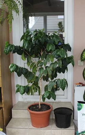 Я свой пересаживала в начале марта, как только увидела, что стали закладываться бутоны и дерево пошло в рост. Горшок был у него маловат, одни корни. Фактически, я перевалила его в большего размера горшок в кислую землю. Бутоны развивались очень медленно. Цветение длилось пару недель, так что сбылась моя мечта посидеть под собственным цветущим кофейным деревом и пить ароматный кофе...