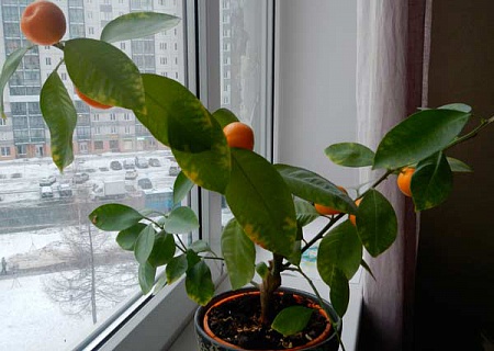 Мандарин уходит под зиму с плодами, что истощает растение, сейчас следует оборвать плоды, дать отдохнуть ему, под кашпо подложить кусок пенопласта, толщиной 2см., поливать реже, не заливая, давать подсыхать грунту, что бы к корням проходил воздух, учитывая, что от радиатора отопления поднимается сухой и жаркий воздух, чаще опрыскивать растение, если эстетика не очень важна, то, сверху, на радиаторе, можно закрепить лоток, куда время от времени подливать воду, так воздух будет менее сухим, это сейчас, а вообще необходимо подкармливать растение различными удобрениями, в периоды бутонизации и созревания плодов, именно для этих моментов существуют свои подкормки, а в остальное время для подкормки и наращивания листьев. Если хотите изменить условия содержания, то уберите с подоконника, обеспечьте хорошей подсветкой + подкормка с учётом плодоношения + опрыскивание. Еще, не помешало бы, на данном этапе, опрыскать растение Эпином-Экстра, а почву, пролить раствором Фитоспорина -М, попробуйте поискать информацию, в интернете, про содержание данного вида в квартире.