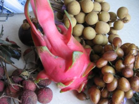 Большая розовая фигня - питайя. Прорастает как сорняк, хоть всю квартиру засаживай. Получается из неё худой червяковидный ползучий кактус. Розовое пупырчатое - личи. Litchi chinensis Наверху - вроде бы лонган. Longan (Euphoria longana)