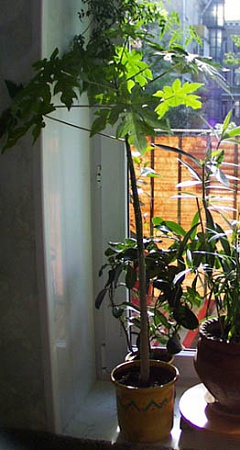Это моя папайя прошлым летом. Растет быстро, но требует тепла. Даже летом на балконе не любит находится. Не нравятся перепады температуры. В этом году обрезала ее. Места мало, а растения становятся все больше и больше. Дала несколько "веточек". Стоит сейчас под лампой. Сейчас, конечно, ей не очень.