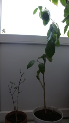 вот тот высокий с большими листьями - скорее всего лимон. Точнее ничего не скажешь - очень плохо видно. Перспективы у него будут если Вы его поставите на гораздо белле светлое место, чем сейчас - сейчас просто ужас как темно. Ставьте на балкон, если есть. Я бы отрезала две боковые веточки и оставила тольок центральную - получился бы неплохой ствол. А потом растила бы "шапочку" наверху.