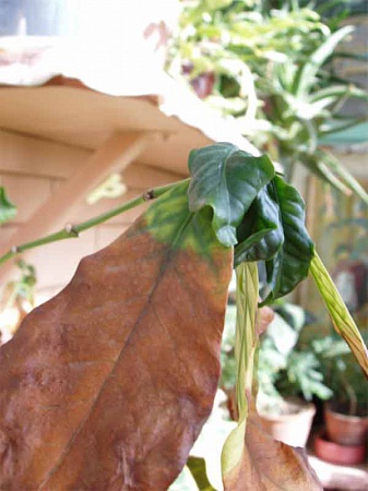 Никак не получается с кофе. Листикиотмирают от концов к черешку и отваливаются. Новые листики вылазят мелкие и какие-то деформированные. При поливе воду подкисляю лимонной кислотой, пробовал подкармливать Кемирой и Порконом, давал микроэлементы, освещение хорошее (стиот на лоджии, прямок солнышко только с утра на пару часов, потом яркий рассеяный свет) - ничего не помогает. Кто может чего подскажет?