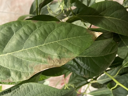 Растениям год, стоят на застеклённом балконе, температура ночью +15, днём +18-20, без досвета, южная сторона. Окно не открывается. Пару недель назад начали чернеть листья. Темно-коричневые сухие пятна, чернеет сначала кончик, затем лист с боков. В начале осени были пересажены в большие двойные горшки 32см диаметром, корневая развивается достаточно быстро. Горшок двойной. С чем может быть такое связано?