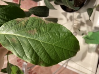 подскажите, пожалуйста, что с моим авокадо? Вдруг растение начало терять листья, и на листьях появляются пятна и подсыхают кончики.