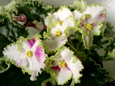 АллаUral, Wildy (Москва), Чтобы не быть голословной по поводу моей Buckeye Irish Lace.Зацвела та же самая розетка.Как видите-химерность уже не та.А вот из под листа с красным оттенком(слева вверху)наверняка пойдет химерный цветок