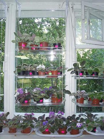 Подносы из хоз. магазина, проделываются отверстия по краям в углах всего 4, шнур можно любой толщины, чтобы в отверстие пролезал, и такой, что не тянулся сильно. Полки относительно друг друга крепятся простыми узелками, два или три узла, чтобы получился толстый узел, не пролезающий в отверстие. На них полки и садятся, все держится прекрасно, так как полки получаются не тяжелые, горшочки пластмассовые небольшие. Влезает 6-8 горшочков в зависимости от размера розетки. Подносы размером 45х35 см. Единственное надо, чтобы кронштейны были хорошо закреплены шурупами, т.к. полки хоть и не тяжелые, но все равно надо перестраховаться, а то все как загремит.