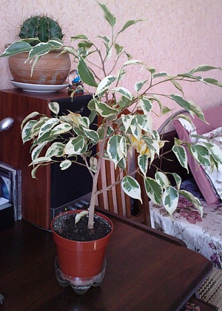 Здравствуйте всем! 2,5 года назад принесла мне мама веточку пестролистого фикуса (сорт не знаю), я ее в водичке укоренила, потом посадила. Из этой веточки за первый год выросло небольшое деревце см 35, и остальные 1,5 года он не двигался в росте никуда, только в прошлом году сильно листопадил. Посмотрела что ему места в горшочке совсем нет, вот вчера перевалку ему сделала. Так вот стволик у него ровненький, ни куда уже не гнется, хочу из него штамб сделать. Как мне сделать чтоб у него по мере роста ствол не дохлой веткой был, а норм такой толстый? Он у меня с самого начала хотел куститься, но я боковые веточки сразу убрала. И почему рост замедлился? Его можно как нибудь стимулировать? Буду благодарна за ваши советы.