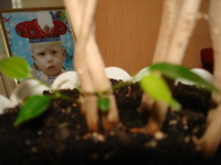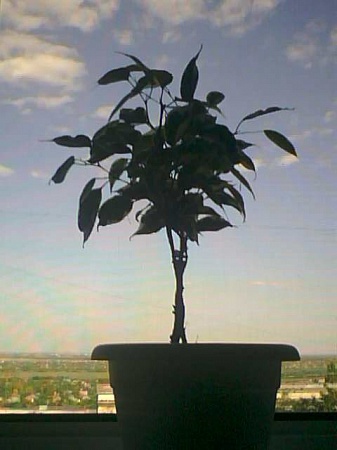 Вблизи все далеко не так радужно - в свое время слишком заглубила черенок и пропустила появление 2х стволов. В результате имеется 2 параллельный тонких (у еще одного бенджамина, которому столько же лет и который растет в тех же условиях ствол толще) ствола и еще несколько тонкий маленьких стволиков