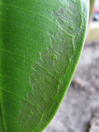 Коллеги, нужна ваша помощь! У меня растет фикус, с момента посадки дал уже два новых листочка, сейчас третий, но что-то неладное стало происходить с самым нижним листиком! На нем появился странный след, вроде верхний слой листа что-то разъедает, и это пятно увеличивается! На остальных листах ничего подобного нет. Посмотрите, пожалуйста, на фото, подскажите, что это может быть? Стоит он у меня на одном и том же месте, на южном подоконнике, поливаю, когда просохнет верхний слой почвы. Может это от солнца? Или может я его все таки залил? Или это он наоборот так засыхает?