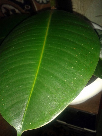 Про пятнышки могу сказать следующее. Это, скорее всего, устьица - "ноздри" фикуса. Он через них дышит. Либо какие-то желёзки. Во всяком случае, такие пятнышки есть у всех фикусов, и это нормально.