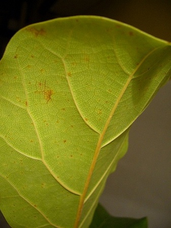 На фикусе лирато какие то мелкие пятнышки. С обратной стороны листа их лучше видно. И сам фикус более светлого цвета чем у знакомых и в магазинах. Фикус мне такой подарили ( сейчас вылезает новый лист. Но я очень боюсь, что если это какая то болезнь то она может перекинуться на другие мои фикусы. Подскажите, что это?