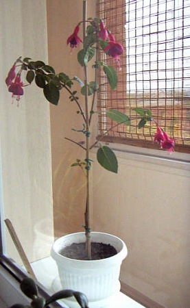 Можно мне спросить о фуксии, чтобы новую тему не заводить? Дали мне вот такое стройное худенькое растение. Дали цветущим. Не пересаживала. Отцвело и остановилось. Посоветовали удобрить (для цветущих). Удобрила дважды: для цветущих и навозной вытяжкой. Зацвело опять. Было кривое. Привязала: пытаюсь выравнять ствол. Частично удалосй исправить кривизну ствола. Теперь кривой ствол только у основания.